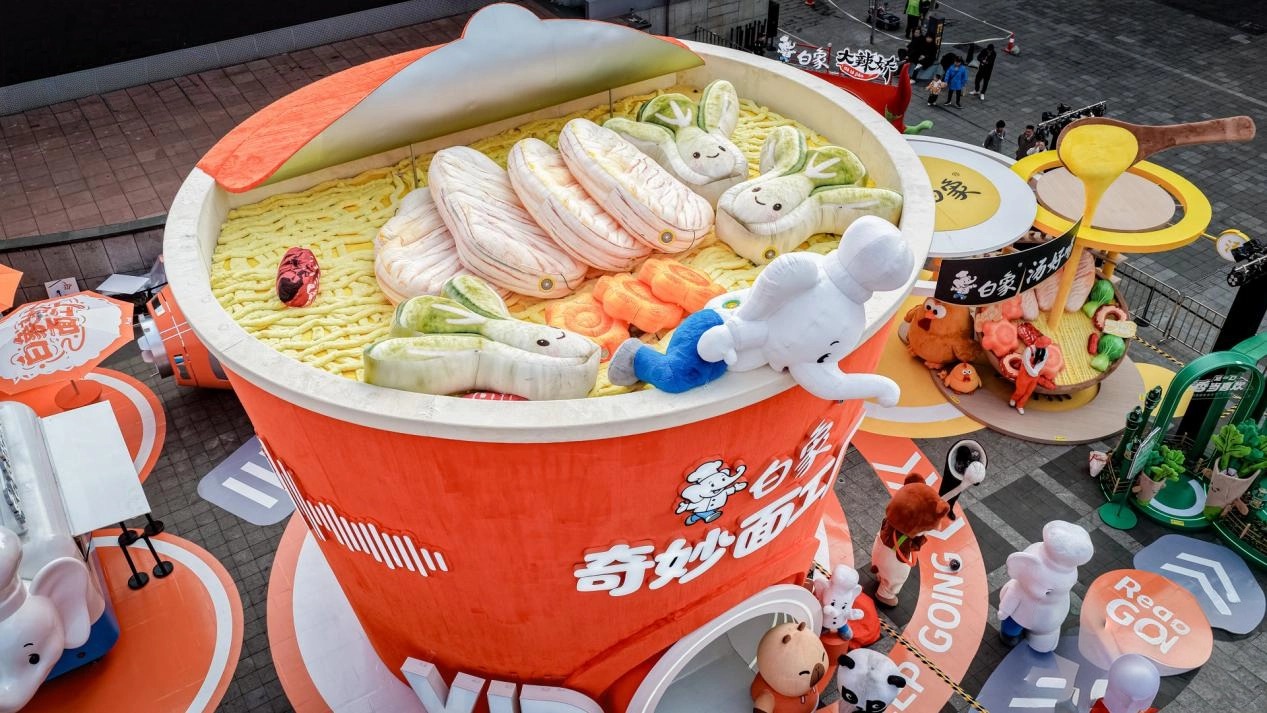 首先,以场景创新解锁情绪价值,打造双重冲击。Z世代对情绪疗愈需求强烈,白象跳出传统营销框架,将“巨物震撼”与“毛绒治愈”巧妙融合。巨大的毛绒方便面装置、软萌的食材造型场景,打破了对食品品牌的固有认知,既带来超出预期的视觉奇观,又凭借毛绒材质的温暖属性,为年轻人构建了逃离“班味”的情绪出口。这种创新精准拿捏了年轻人“通过沉浸式体验释放压力”的需求,让品牌成为情绪共鸣的载体,实现了从“传递信任”到“触动人心”的跨越。